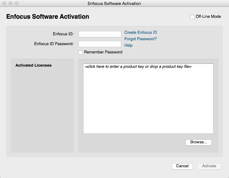 4. 下図のウィンドウが表示されますので、ステップ2で Enfocus ID 作成時に登録した Email address を「Enfocus ID」に Password を「Enfocus IDパスワード」に入力し次に、<プロダクトキーを入力またはプロダクトキーファイルをドロップするにはここをクリック>と表記されているところをクリックして、製品版に付属しているプロダクトキーを入力するかまたは「プロダクトキーファイル」をドロップします。