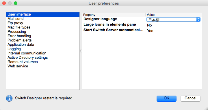 15. User interfaceタブのDesigner languageを「日本語」に変更し「OK」ボタンをクリックします。