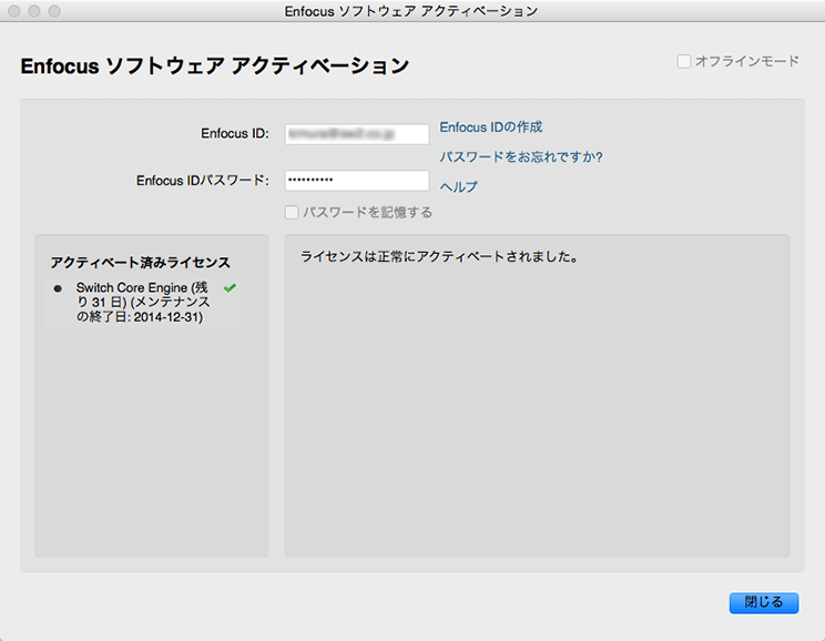 「閉じる」ボタンをクリックして「Enfocusソフトウェアアクティベーション」を終了します。